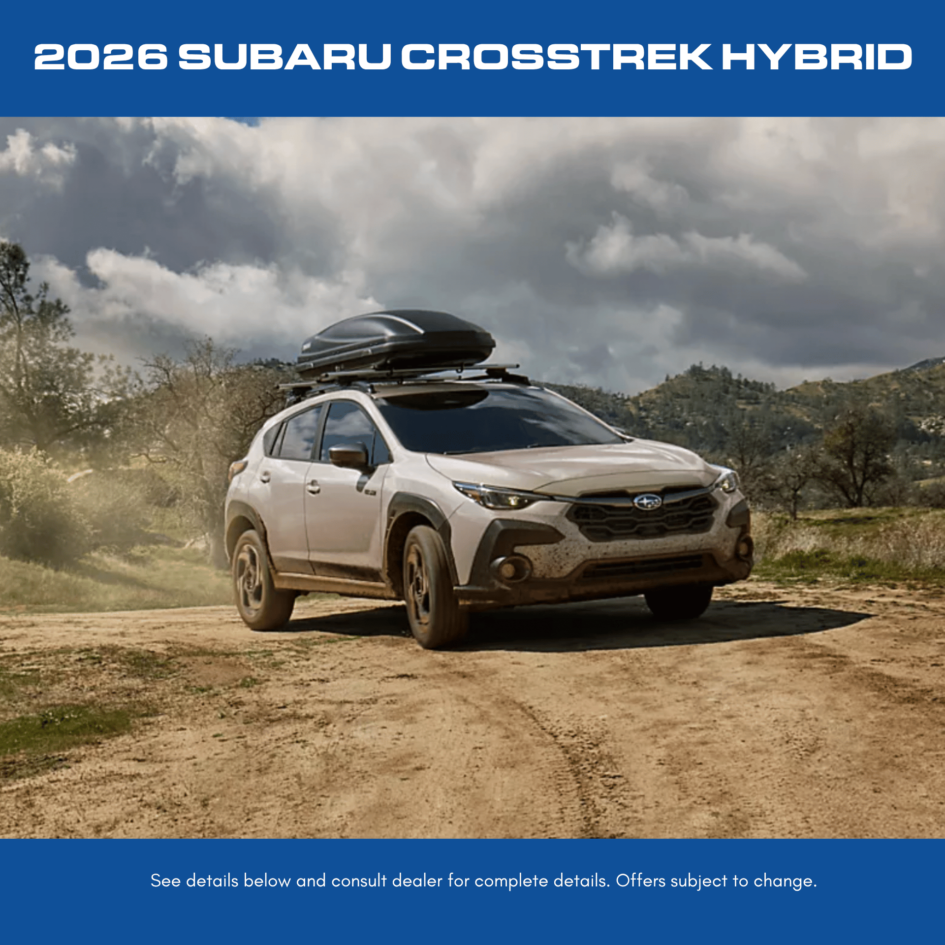 2026 Subaru Crosstrek Sport Hybrid (Stock - 260764, Model Code TRE-26) 1.9% APR financing up to 36 months. $16.69 per month per $1,000 financed. Available on stock #260764 at $229/month for 36 months with $3,999 Down, plus tax, title, license, and $395 dealer fee.. 7,500 miles/year. To approved credit. While supplies last.