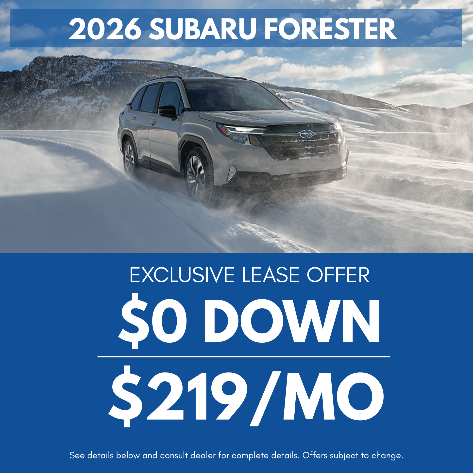 2026 Subaru Forester (Stock - 260515, Model Code TFB) 1.9% APR financing up to 75 months. $22.80 per month per $1,000 financed. Lease at $269/month for 36 months with $0 due at signing, plus tax, title, license. 7,500 miles/year. To approved credit. While supplies last.