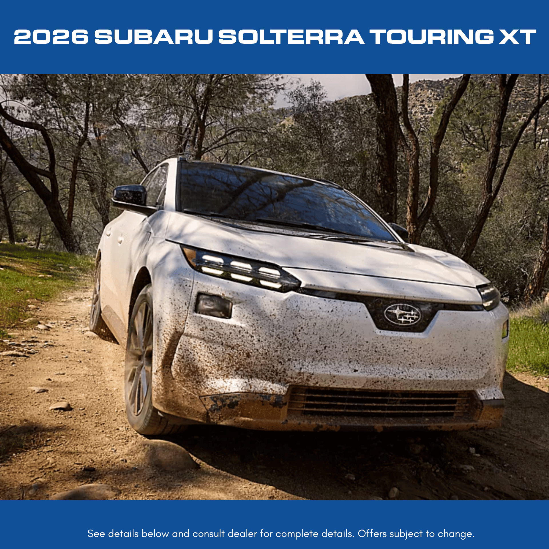 2026 Subaru Solterra Premium (Stock - 261042, Model Code TED 11) 0% APR financing up to 75 months. $22.53 per month per $1,000 financed. Lease at $224/month for 36 months with $3,999 due at signing plus tax, title, license. 7,500 miles/year. $395 dealer fee. To approved credit. While supplies last.