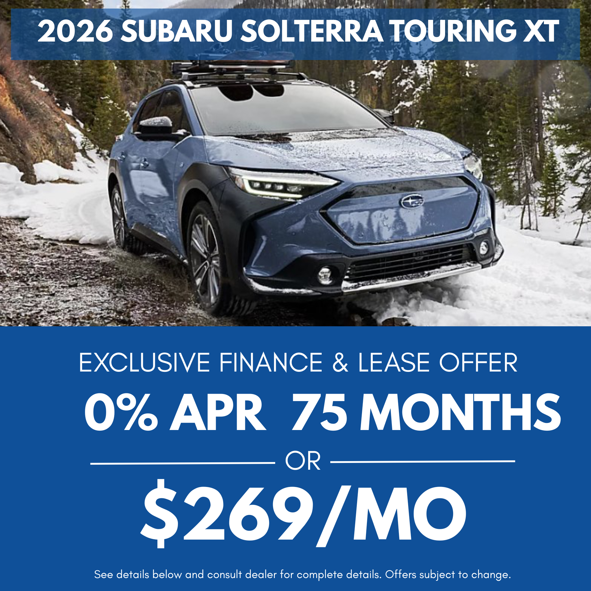 2026 Subaru Solterra Touring XT (Stock - 260809, Model Code TEK) 0% APR financing up to 75 months. $22.53 per month per $1,000 financed. Lease at $279/month for 36 months with $3,999 due at signing plus tax, title, license. 7,500 miles/year. $395 dealer fee. To approved credit. While supplies last.