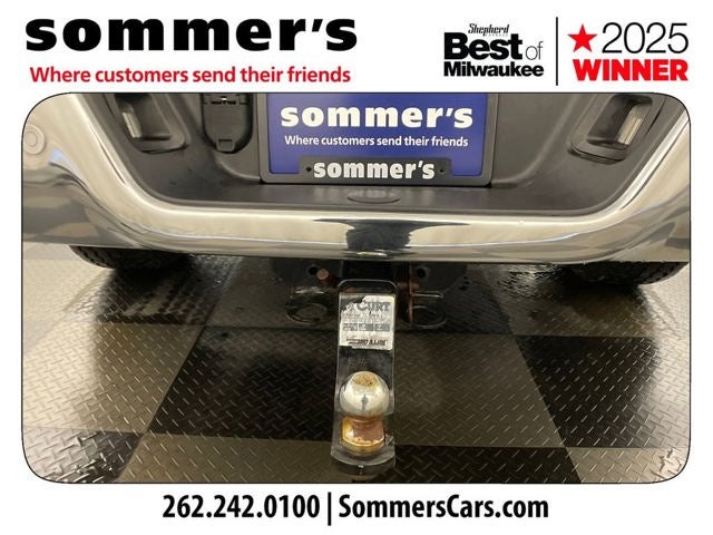 Bright White Clearcoat paint, chrome wheels, automatic headlights, heated power mirrors, privacy glass, and a tow hitch give it a strong, practical look.