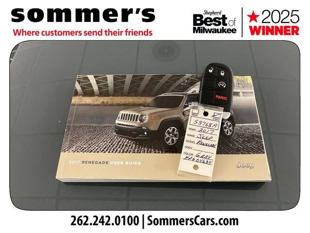 Find this 2017 Jeep Renegade Latitude at Sommer's Automotive in Mequon, just north of Milwaukee serving Wisconsin drivers across Cedarburg, Grafton, Port Washington, Shorewood, Whitefish Bay, Fox Point, Bayside, Glendale, Wauwatosa, Brookfield, West Bend, Menomonee Falls, Germantown, Sussex, Hartford, Oconomowoc, Pewaukee, New Berlin, Franklin, Oak Creek, Racine, Kenosha, Muskego, Mukwonago, Hales Corners, Cudahy, South Milwaukee, and many more communities throughout the greater Milwaukee, Ozaukee County, Washington County, Waukesha County, and southeastern Wisconsin area.
