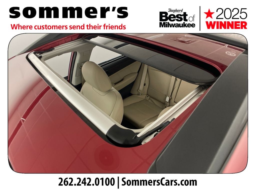 Crimson Red Pearl paint stands out alongside 18-in aluminum wheels, LED headlights, fog lamps, and a power sun/moonroof. The Warm Ivory leather interior features woodgrain trim and an auto-dimming rearview mirror.