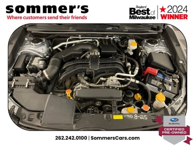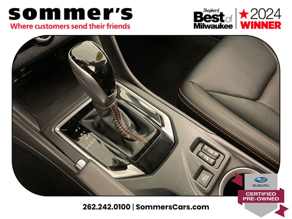 AWD | 2.5L H-4 | CVT w/dual-mode | 27/34 MPG | Leather seats w/heated fronts & power driver seat | Heated mirrors | Apple CarPlay & Android Auto | Adaptive cruise control | Pre-collision braking/front collision mitigation | Lane Keep Assist & Lane Departure Warning | Blind Spot Monitor w/Rear Cross-Traffic Alert | Back-up camera | LED headlights w/auto high beams + fog lamps | Auto-dimming rearview mirror | Keyless start & entry w/power windows/locks | 17 aluminum wheels & rear spoiler | Roof rails/luggage rack | Wi-Fi hotspot, Bluetooth®, HD Radio & satellite radio