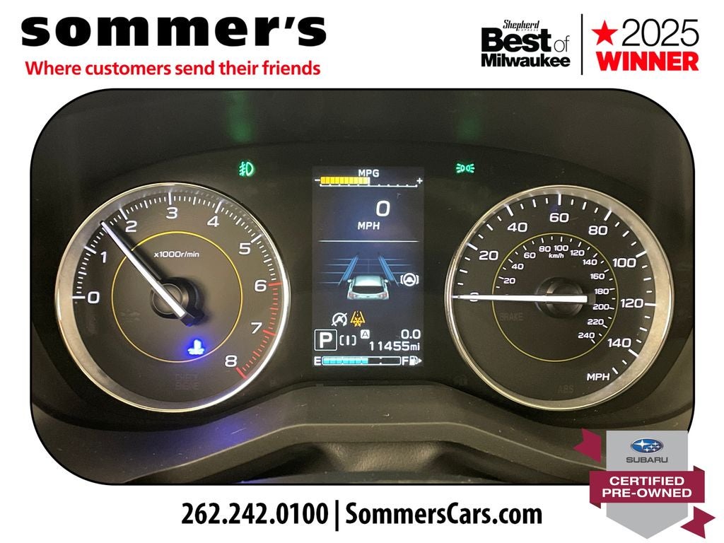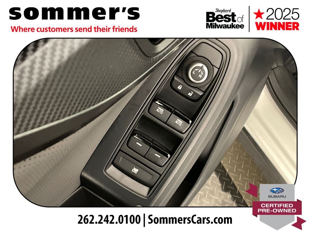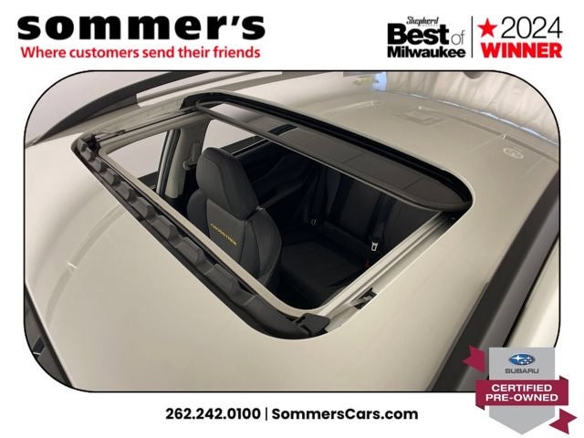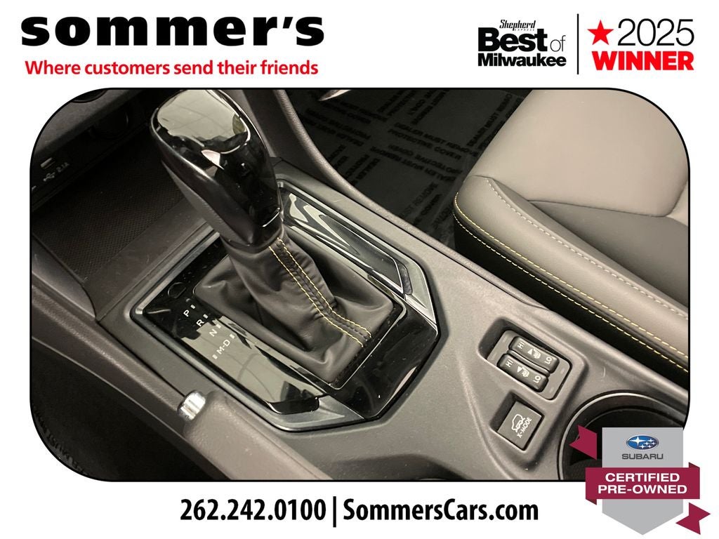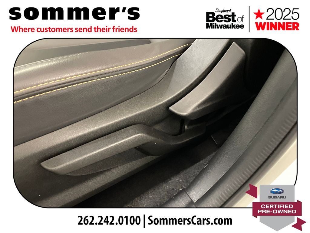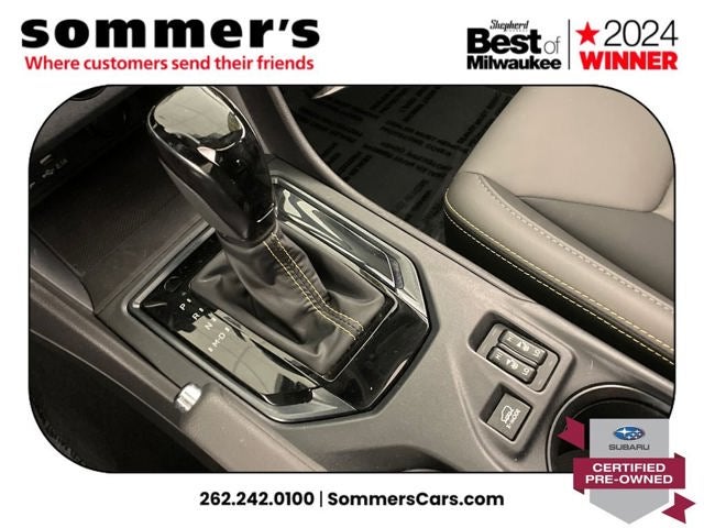 AWD | 2.5L H-4 | CVT w/dual shift mode | EyeSight Pre-Collision Braking | Adaptive Cruise Control w/Lane Centering | Blind Spot Monitor & Rear Cross-Traffic Alert | Apple CarPlay & Android Auto | Sun/Moonroof | Heated front seats | Premium synthetic seats w/yellow stitching | Wi-Fi hotspot | Back-up camera | Keyless entry & push-button start | Aluminum wheels | Fog lamps & LED DRL | Privacy glass & rear spoiler | Crystal White Pearl ext. | Gray interior w/yellow stitching