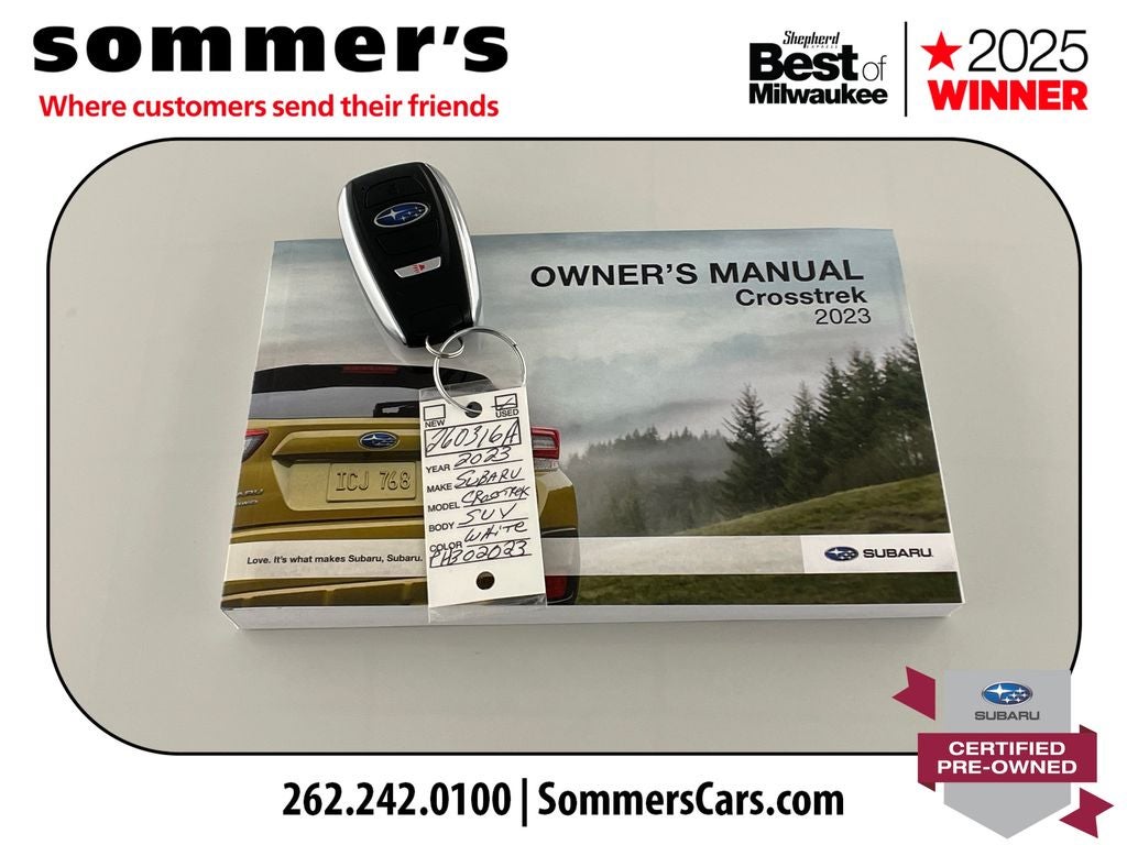 Find this 2023 Subaru Crosstrek Sport at Sommer's Automotive in Mequon, just north of Milwaukee serving Wisconsin drivers from Cedarburg, Grafton, Port Washington, Shorewood, Whitefish Bay, Fox Point, Bayside, Glendale, Wauwatosa, Brookfield, West Bend, Menomonee Falls, Germantown, Sussex, Hartford, Oconomowoc, Pewaukee, New Berlin, Franklin, Oak Creek, Racine, Kenosha, Muskego, Mukwonago, Hales Corners, Cudahy, South Milwaukee, and many more communities throughout the greater Milwaukee, Ozaukee County, Washington County, Waukesha County, and southeastern Wisconsin area.