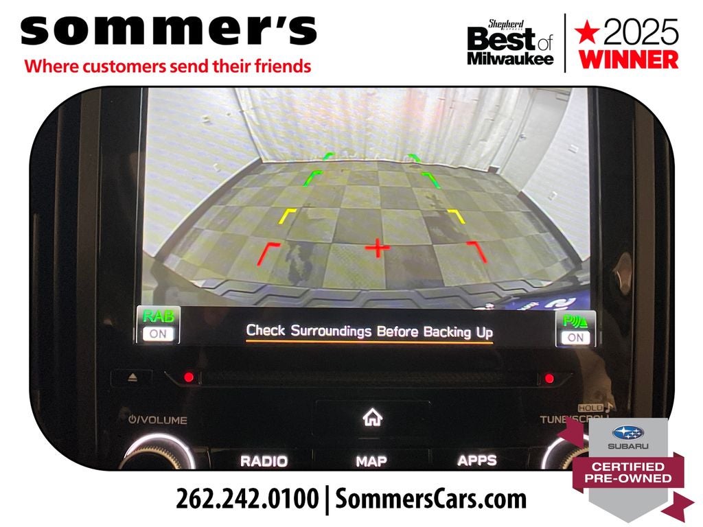 AWD | 2.5L H-4 | CVT | 26/33 MPG | Panoramic moonroof | Leather seats - heated front and rear | Heated steering wheel | Driver memory seat | Power passenger seat | Navigation system | Apple CarPlay/Android Auto | Premium sound | WiFi hotspot | Blind-spot monitor | LED headlights w/auto high beam & DRL | Fog lamps | Back-up camera | Dual-zone climate control | Keyless entry/start | Aluminum wheels | Autumn Green Metallic ext | Saddle Brown interior | Roof rails | Rear spoiler