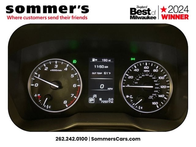 AWD | 2.5L H-4 w/CVT | 27/35 MPG | Leather heated front and rear seats | Apple CarPlay/Android Auto | Premium sound system | Adaptive cruise control | Blind-spot monitor | Lane keep assist | Back-up camera | Multi-zone climate control | Wireless charger | Auto-dimming mirror w/approach light | LED headlights w/auto high beam | Fog lamps | Heated mirrors w/turn signals | Aluminum wheels | Universal garage door opener