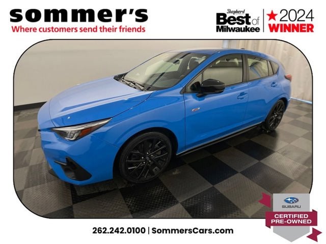 Find this 2024 Subaru Impreza 5-Door RS at Sommer's Automotive in Mequon, just north of Milwaukee serving Wisconsin drivers from Cedarburg, Grafton, Port Washington, Shorewood, Whitefish Bay, Fox Point, Bayside, Glendale, Wauwatosa, Brookfield, West Bend, Menomonee Falls, Germantown, Sussex, Hartford, Oconomowoc, Pewaukee, New Berlin, Franklin, Oak Creek, Racine, Kenosha, Muskego, Mukwonago, Hales Corners, Cudahy, South Milwaukee, and many more communities throughout the greater Milwaukee, Ozaukee County, Washington County, Waukesha County, and southeastern Wisconsin area.