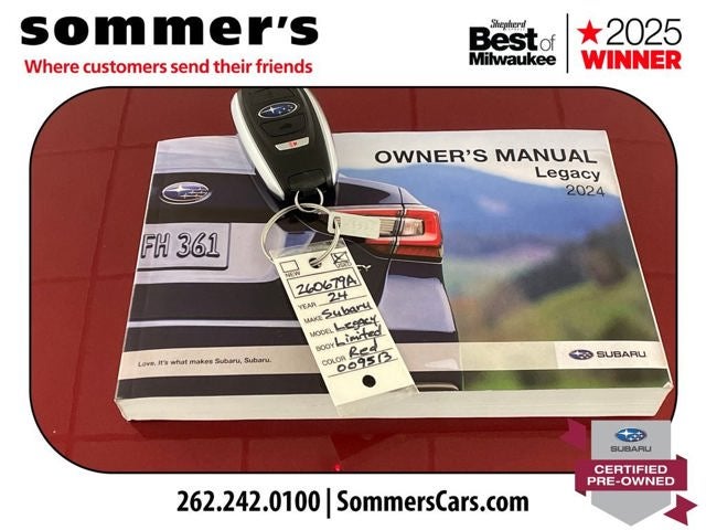 Find this 2024 Subaru Legacy Limited at Sommer's Automotive in Mequon, just north of Milwaukee serving Wisconsin drivers from Cedarburg, Grafton, Port Washington, Shorewood, Whitefish Bay, Fox Point, Bayside, Glendale, Wauwatosa, Brookfield, West Bend, Menomonee Falls, Germantown, Sussex, Hartford, Oconomowoc, Pewaukee, New Berlin, Franklin, Oak Creek, Racine, Kenosha, Muskego, Mukwonago, Hales Corners, Cudahy, South Milwaukee, and many more communities throughout the greater Milwaukee, Ozaukee County, Washington County, Waukesha County, and southeastern Wisconsin area.