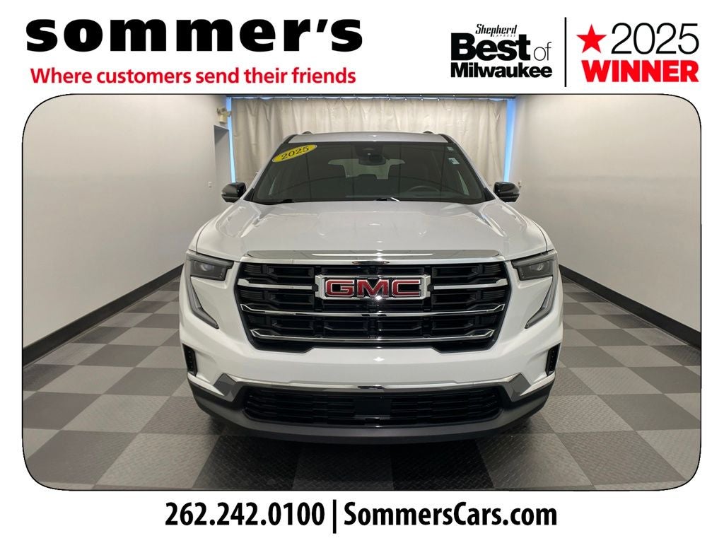 Find this 2025 GMC Acadia Elevation at Sommer's Automotive in Mequon, just north of Milwaukee serving Wisconsin drivers from Cedarburg, Grafton, Port Washington, Shorewood, Whitefish Bay, Fox Point, Bayside, Glendale, Wauwatosa, Brookfield, West Bend, Menomonee Falls, Germantown, Sussex, Hartford, Oconomowoc, Pewaukee, New Berlin, Franklin, Oak Creek, Racine, Kenosha, Muskego, Mukwonago, Hales Corners, Cudahy, South Milwaukee, and many more communities throughout the greater Milwaukee, Ozaukee County, Washington County, Waukesha County, and southeastern Wisconsin area.