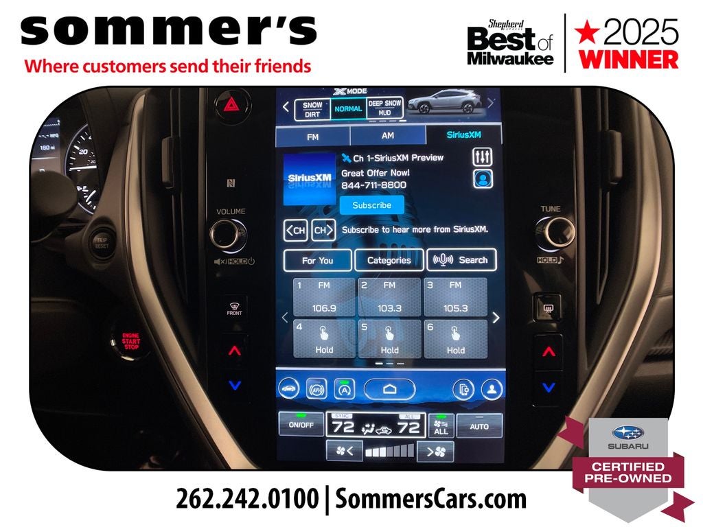 - Radio: Subaru 11.6" Multimedia Plus System -inc: AM/FM stereo, HD Radio, multi-touch gesture high resolution display screen, voice activated controls, Bluetooth® audio streaming and hands-free phone connectivity, Bluetooth® hands-free SMS text messaging connectivity, iPod control capability, SiriusXM w/360L (4 months free trial included/subscription required after), SiriusXM Travel Link (4 months free trial included/subscription required after), smartphone integration: Android Auto and Apple CarPlay w/full screen view and wireless connection, USB and Over The Air (OTA) audio system update, steering wheel audio system and Bluetooth® control switches, 6 speakers (2 dash panel tweeter, 2 front door and 2 rear door), illuminated 3.5mm auxiliary input jack, illuminated front USB A and C input/charge ports and illuminated rear USB A and C charge ports